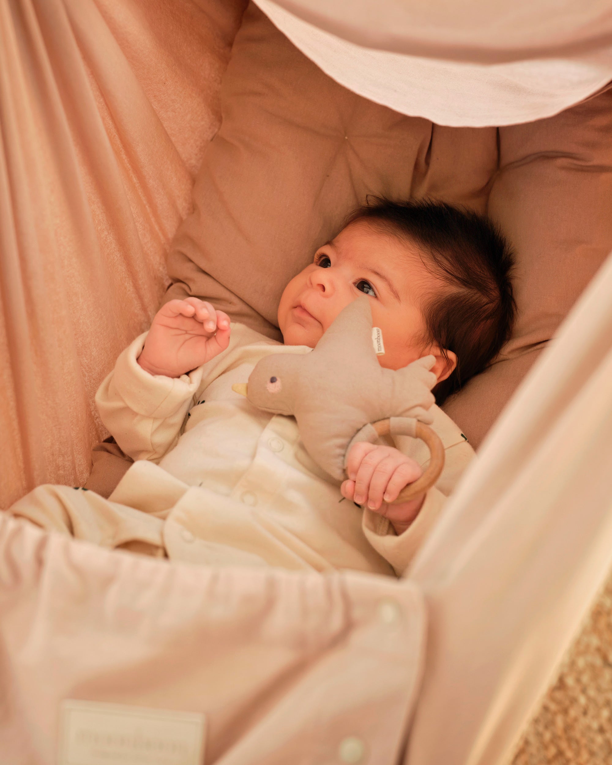 The charming bird rattle invites gentle exploration, capturing your baby’s attention and sparking their curiosity during cozy cuddle moments, perfect for peaceful dreams ahead.